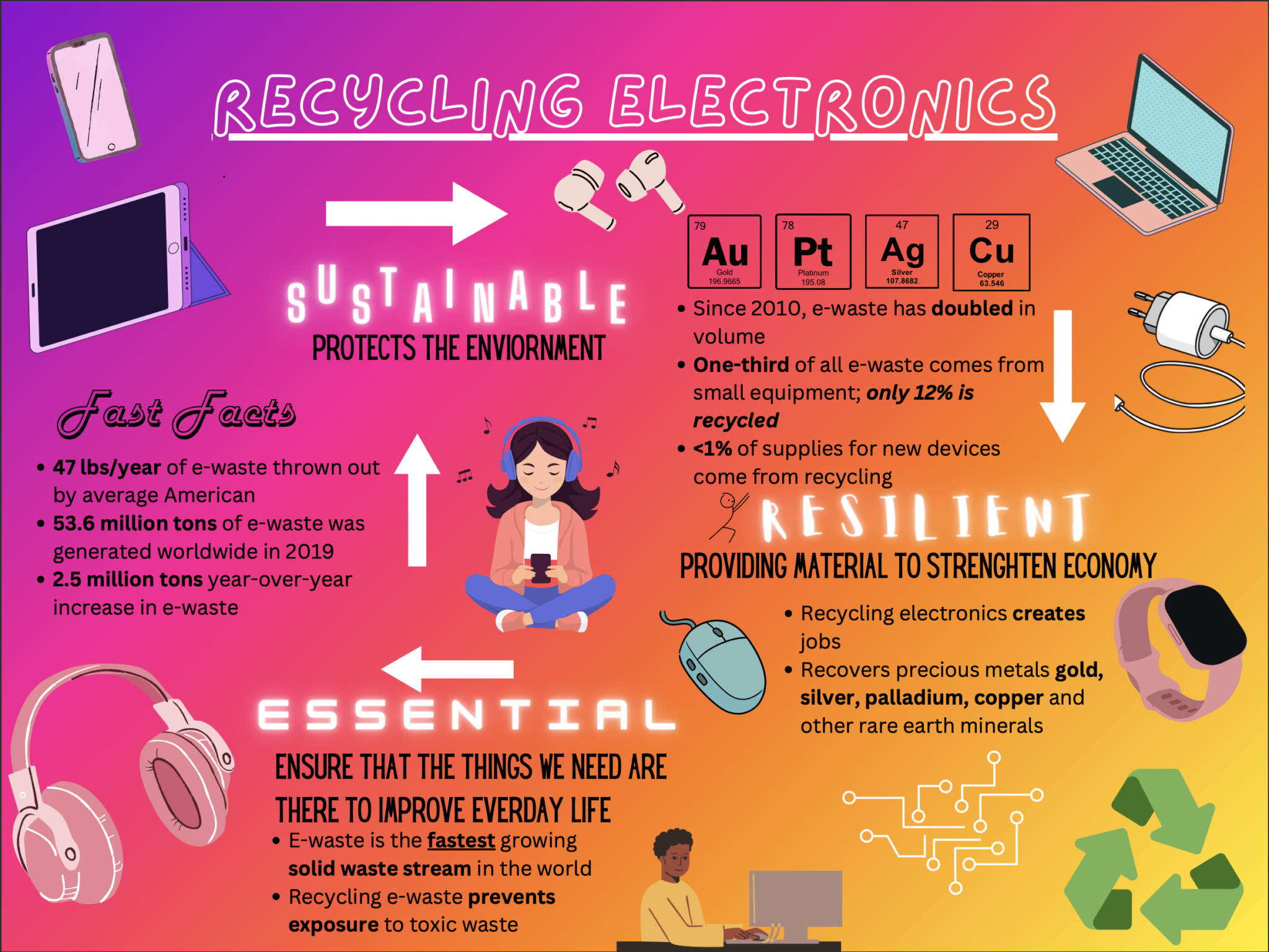 Fourth grader Caroline McKee and fifth grader Maria McKee from Saint Mary’s Catholic School in Spring Lake, MI, created this year’s winning poster submission. Their project represented the process of recycling electronics through three main principles of being Sustainable, Resilient, and Essential.