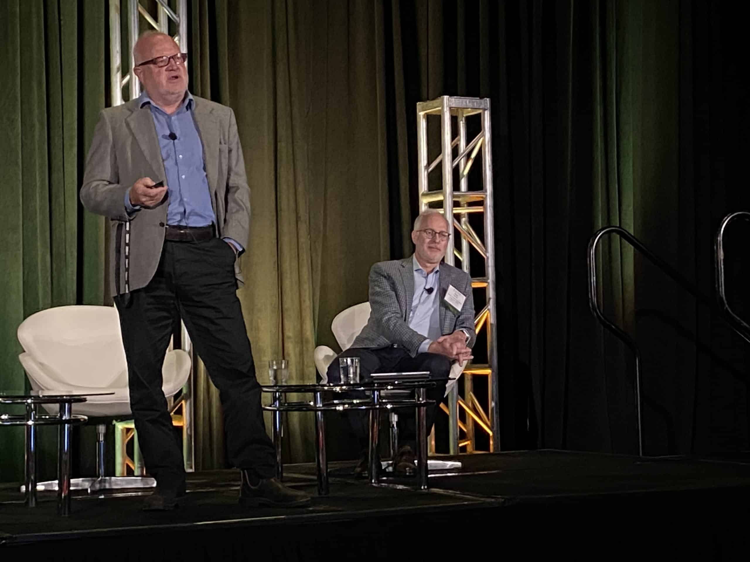 Basel Action Network’s Jim Puckett and ISRI’s Fred Fischer onstage Sept. 21 at the E-Scrap Conference 2022 in New Orleans.