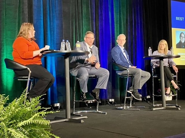 Photos courtesy of Dan Hockensmith. Featured image caption: The U.S. Plastics Pact’s Emily Tipaldo, Michael Hodges of Amcor, Revolution’s Cherish Miller, and Chris Dow of International Recycling Group discuss the future of plastics circularity at the Plastics Recycling Conference. Body image caption: Megan Beyers of the Association of Plastic Recyclers (APR), Nestlé’s John Caturano, APR COO Curt Cozart, and SC Johnson’s Sarah Curran review best practices in designing plastic products for recycling.