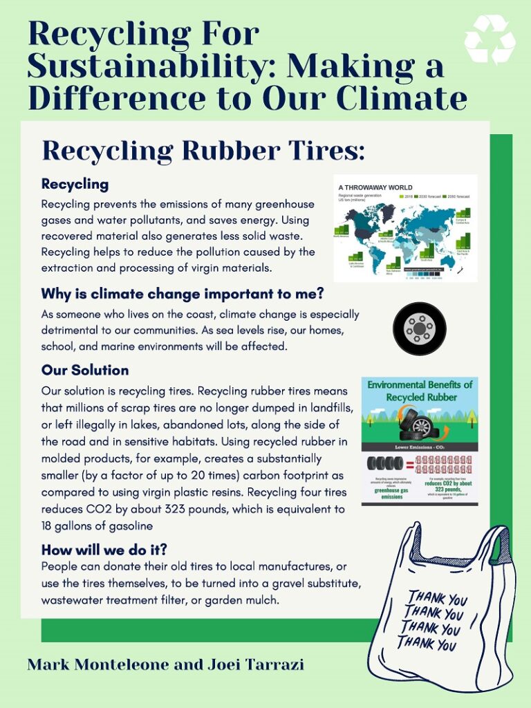 High school seniors Mark Monteleone and Joei Tarrazi from Marine Academy of Science and Technology (MAST) in Highlands, N.J., created this year’s winning poster submission. Their project explores how rising sea levels have affected their coastal community, and how recycling rubber tires can serve as a solution to climate change by reducing carbon emissions. The poster recommends steps people can take locally, such as donating old tires to local manufacturers or use the tires themselves to turn into a gravel substitute, wastewater treatment filter, or garden mulch.