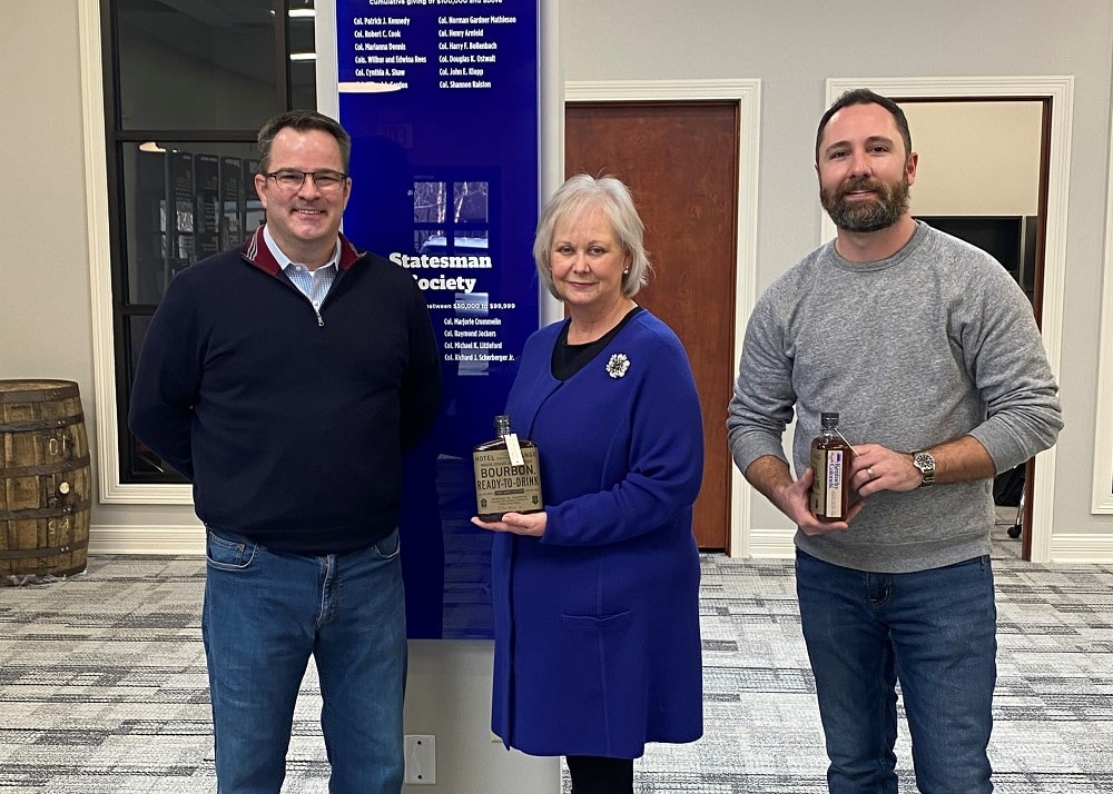 All images courtesy of Trinity Metals. Featured image caption: Brian Holcomb (in truck), senior general manager at Trinity Metals, unloads bottles of bourbon at Honorable Order of Kentucky Colonels headquarters in Louisville, Ky. Body image 1 caption: Wade Conner, CEO of Trinity Metals; Sherry Crose, executive director of the Honorable Order of Kentucky Colonels; and Brian Holcomb, Trinity Metals senior general manager. Body image caption 2: One of more than 600 bottles of Hotel Tango bourbon donated by Trinity Metals to the raffle for tornado relief.